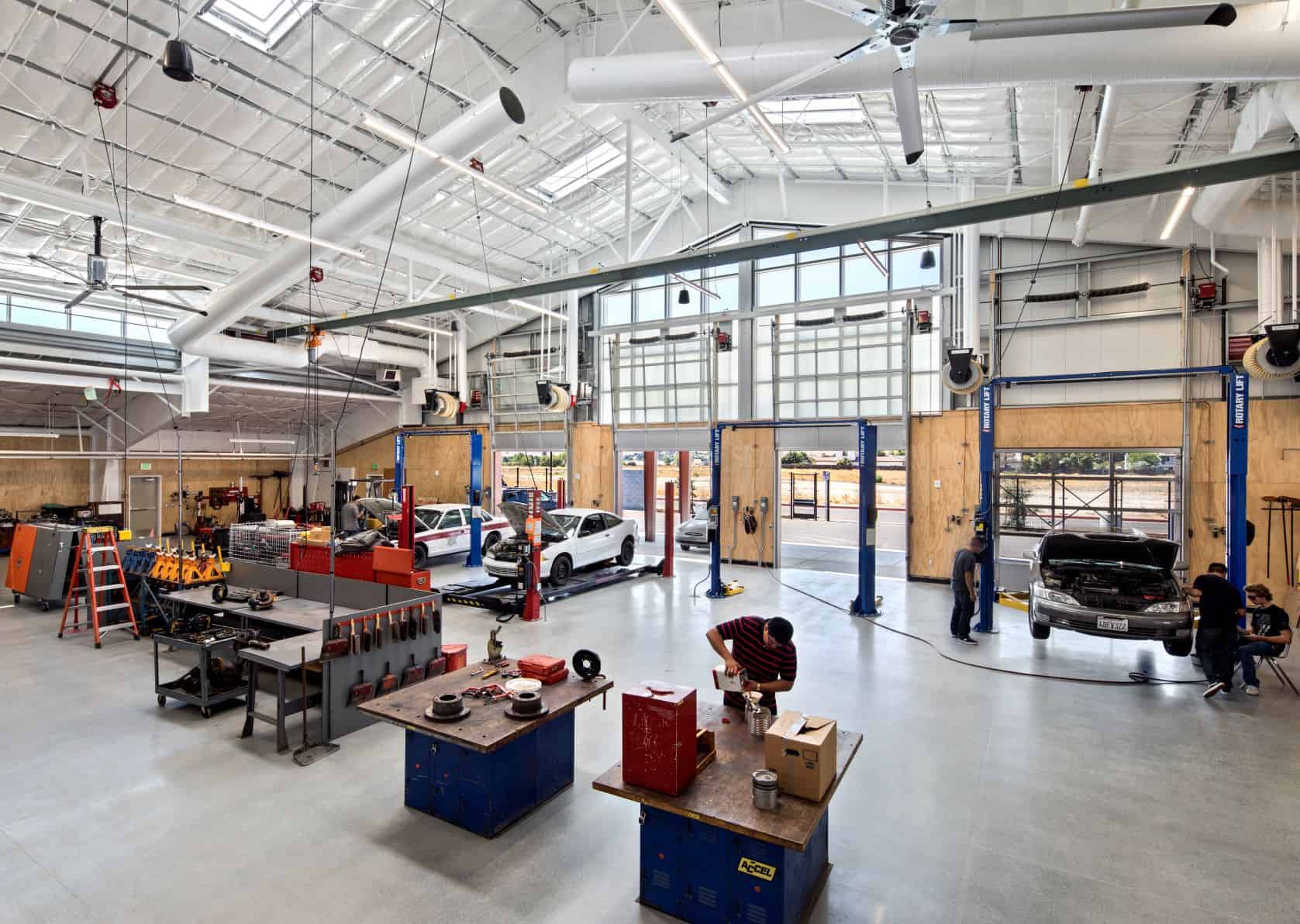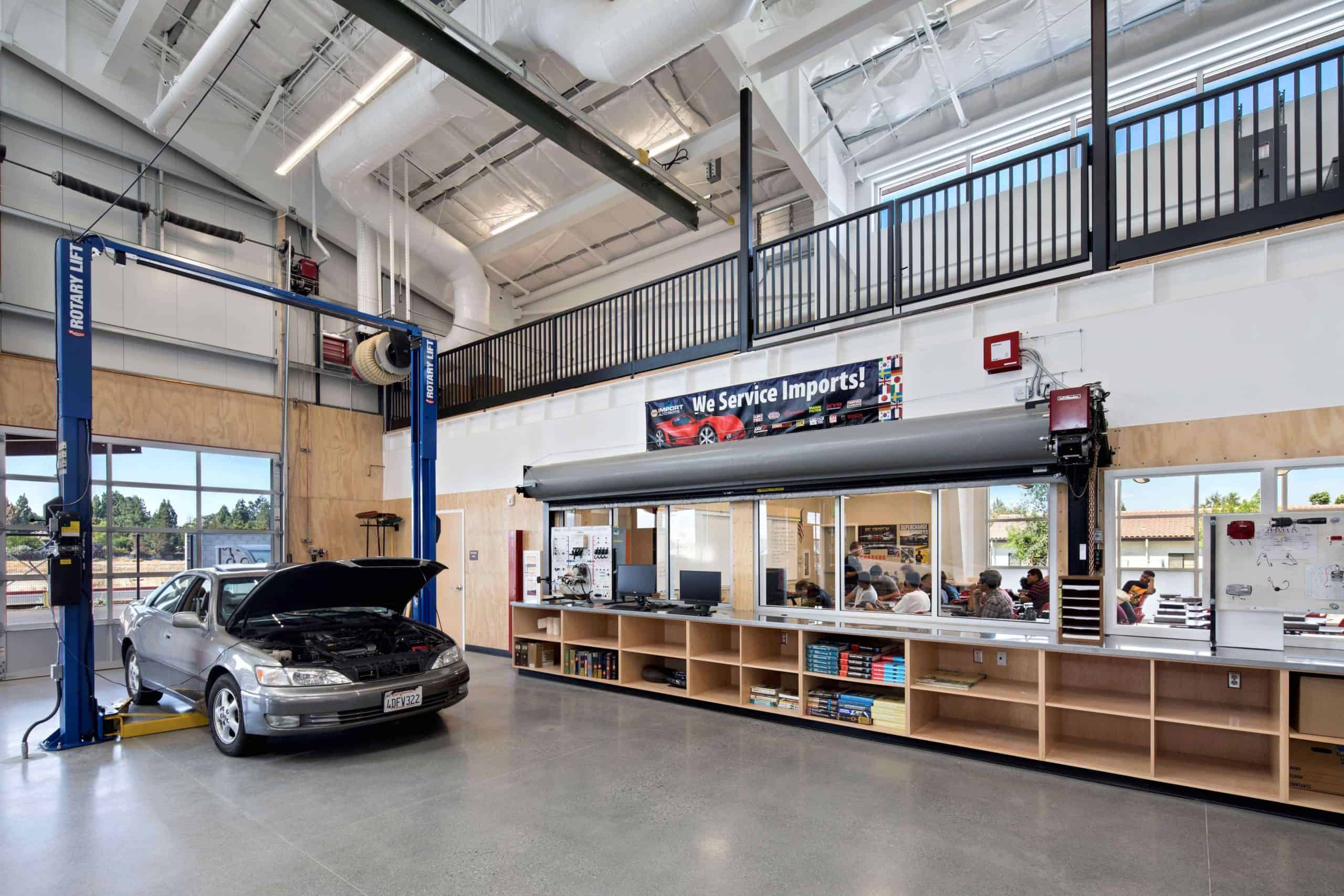 As the community’s only secondary campus, Hollister High School has always played a pivotal role in supplying the skilled workforce necessary to the local economy centered around agriculture. The community voiced their desire for a new state-of-the-art facility that trains students in automotive technology, farm machinery, metal work, wood work, and agricultural and animal sciences- skills that form the backbone of the vibrant local culture. The design used a simple, pre-engineered structure with long spans to enclose large spaces to accommodate a variety of vocational instruction activities. Each shop was paired with an acoustically separate lecture space. The tall ceiling enables storage lofts, while clerestory windows along the center ridge flood the interior spaces with natural lighting.