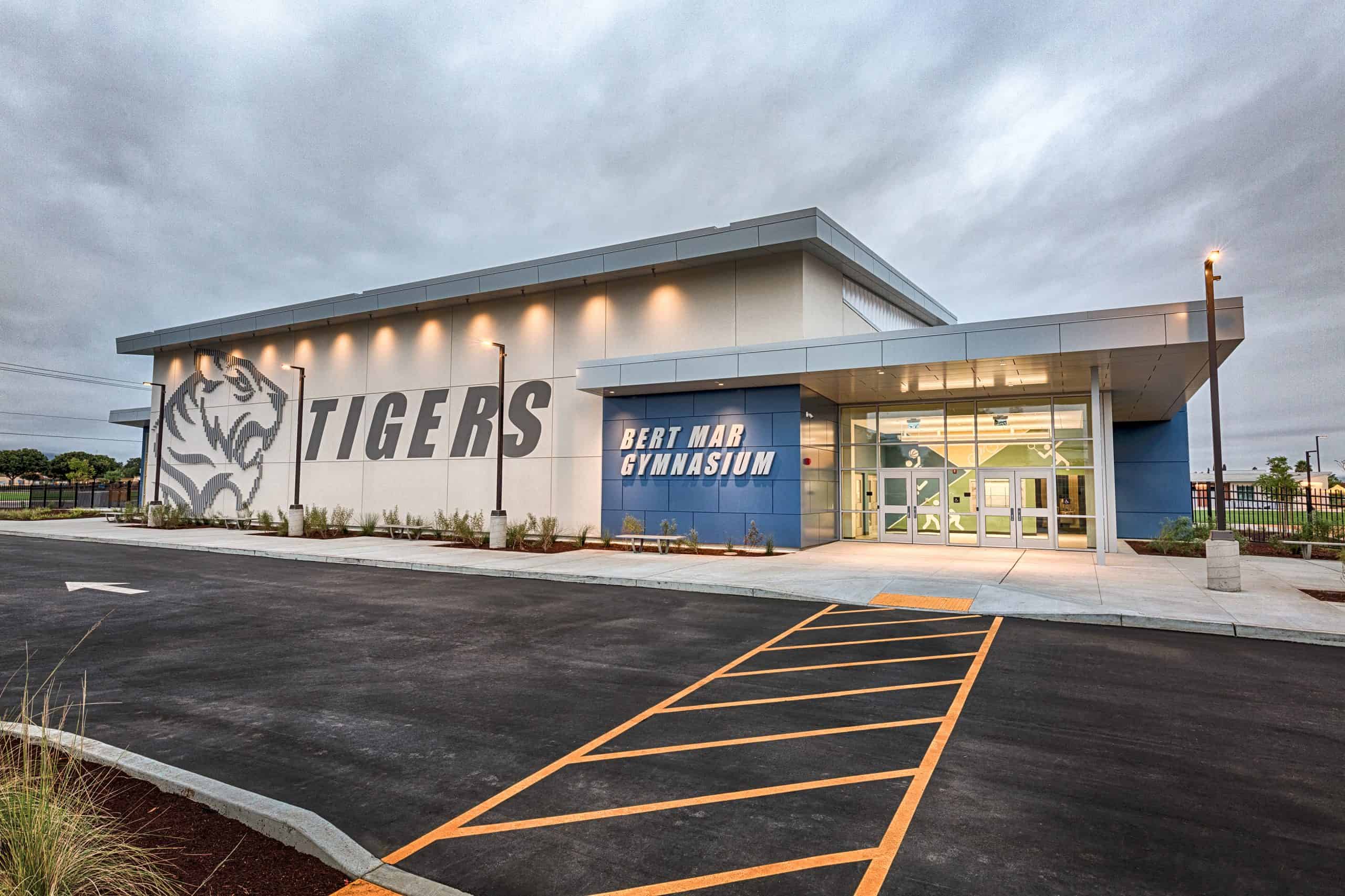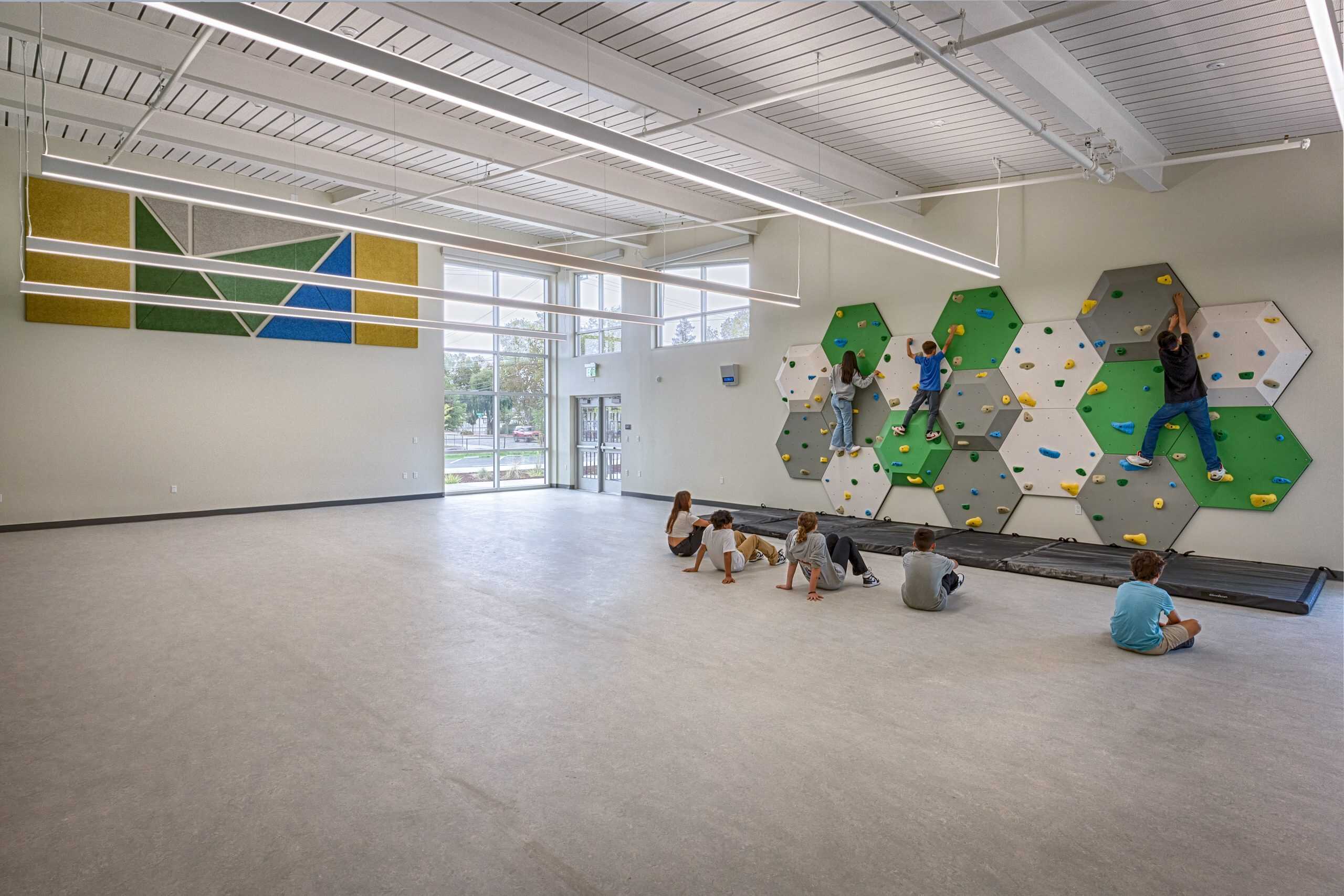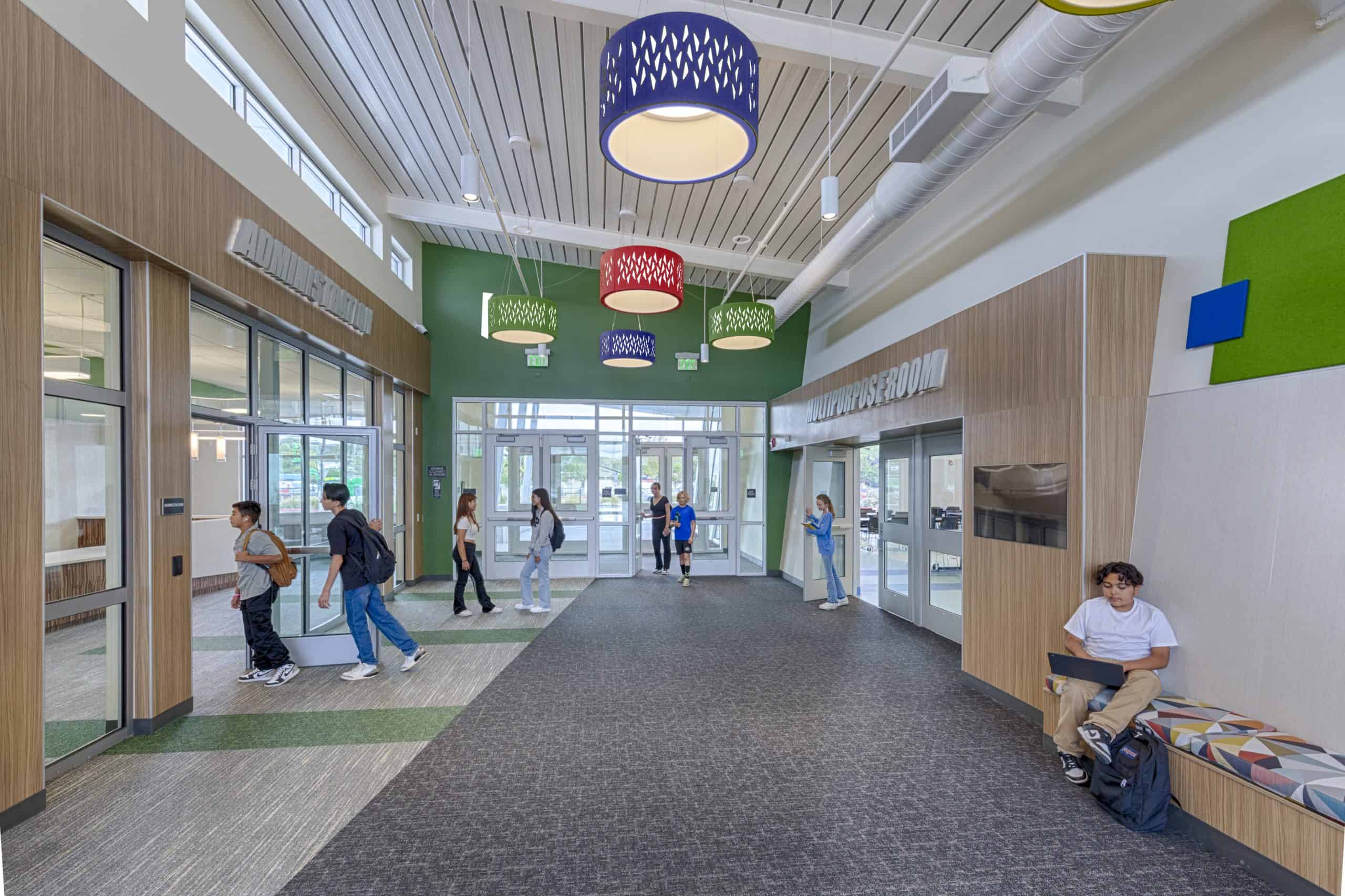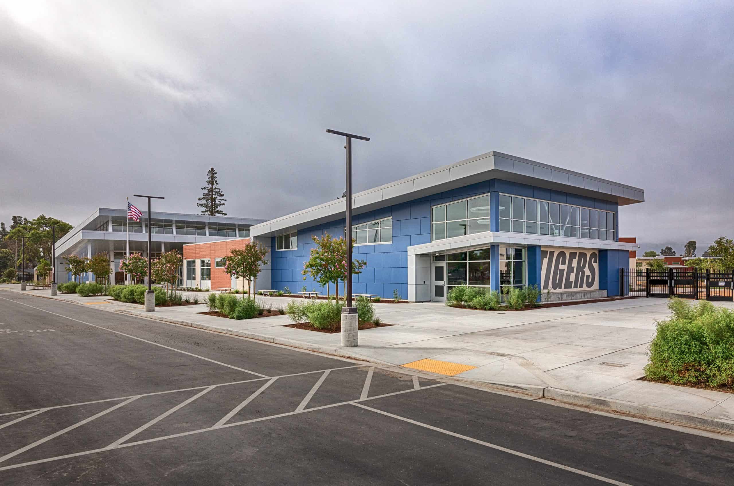 South Valley Middle School was built in the mid 1950’s as a high school and later converted to a middle school. The 21-acre campus, located in a diverse neighborhood, had reached its’ end of life and needed replacement. The new “Village Concept” design includes a completely new look for the school and relocates the entry from a congested neighborhood street to another, providing much needed traffic relief and a safer drop off zone for the students. The school now has new classrooms with outdoor learning areas, science lab and makers space classrooms, a signature administration building, a Multi-Use and library building, and new gymnasium with a weight room and indoor climbing wall. Tiger Quad, at the heart of the school, depicts the school’s mascot’s tiger paw, surrounded by the new outdoor learning spaces. This project was constructed on an occupied campus and was phased to allow for minimum occupancy disruption.